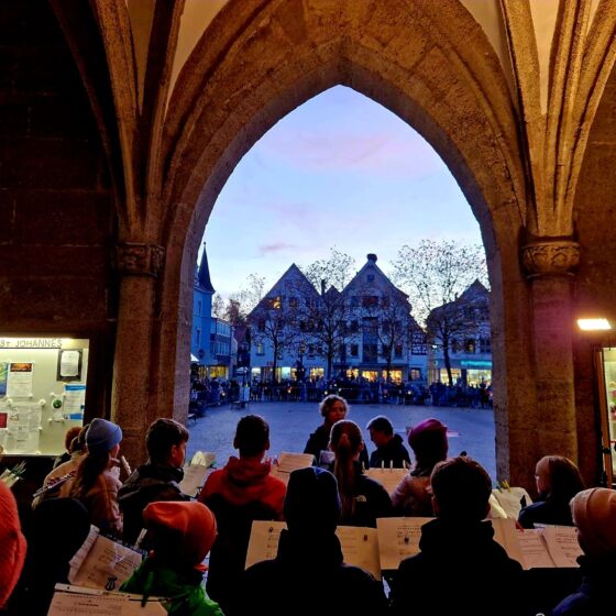 Warm leuchtende Laternen, erwartungsvolle Kinderaugen und festliche Klänge erfüllten am Martinstag den Marktplatz: Die Bläserklasse R6C des Walter-Knoll-Schulverbunds sorgte gemeinsam mit den „Bläserlingen“ der städtischen Musikschule für die musikalische Gestaltung der traditionellen Martinsfeier.