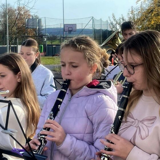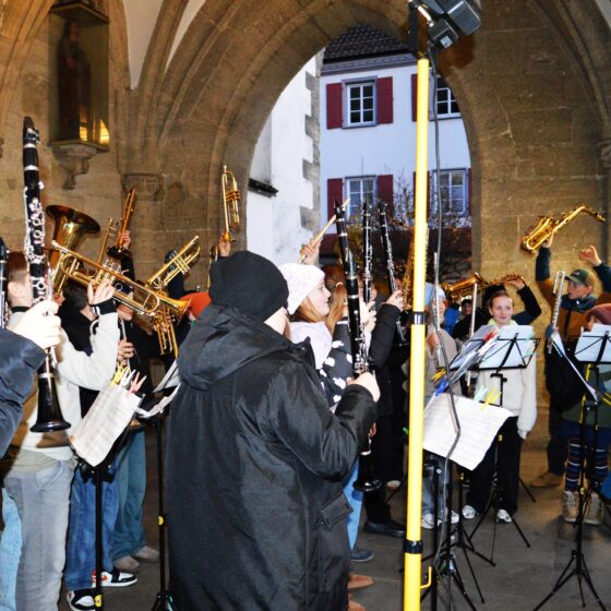 Treffpunkt für die jungen Musikerinnen und Musiker war die Oberamtei. Im Probelokal der Stadtmusik durften sie sich zunächst einspielen – und schon dort lag spürbare Vorfreude in der Luft. Bei ungewöhnlich mildem Novemberwetter setzte sich die große Gruppe anschließend gut gelaunt im Gänsemarsch in Richtung St.-Johanneskirche in Bewegung.