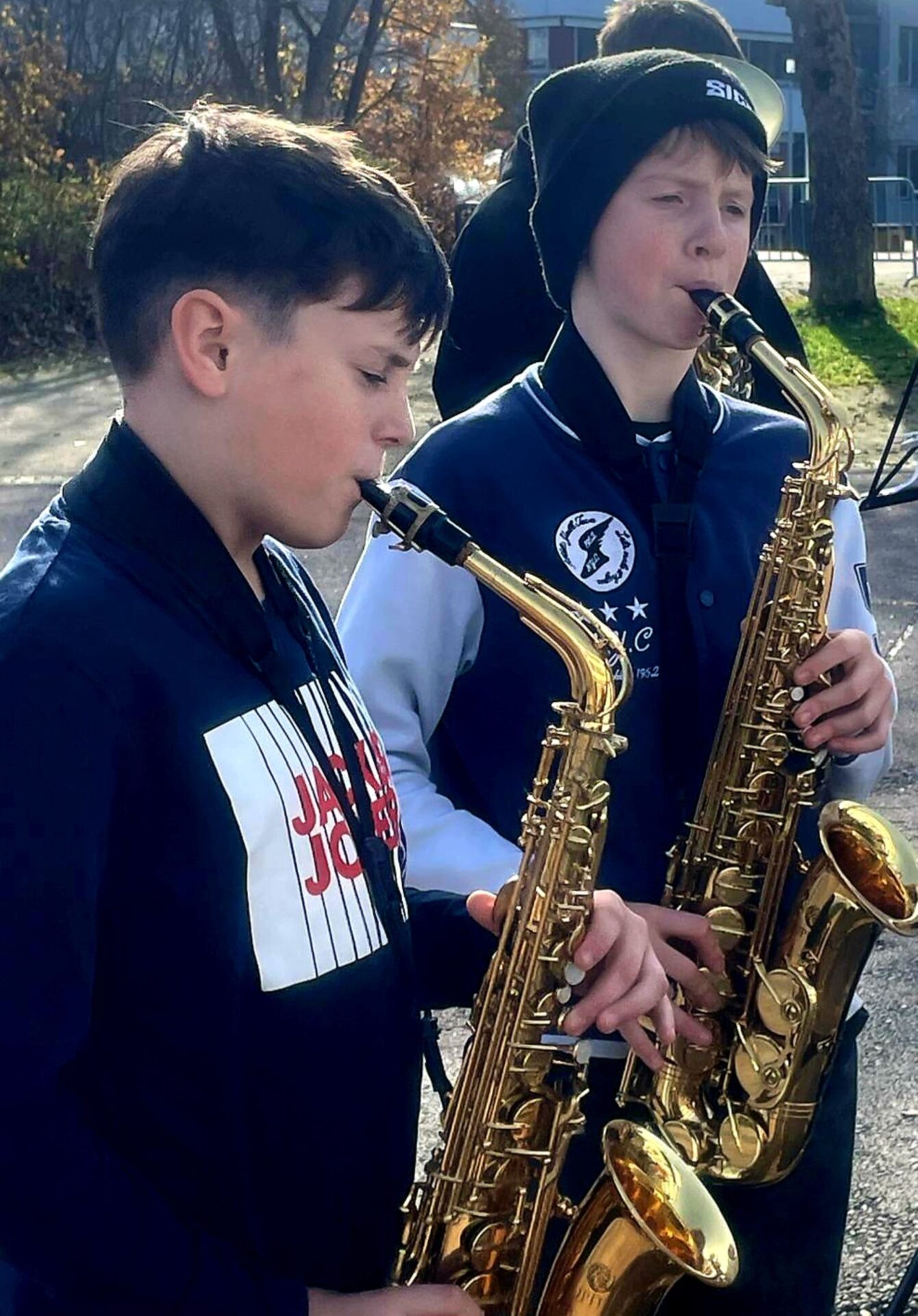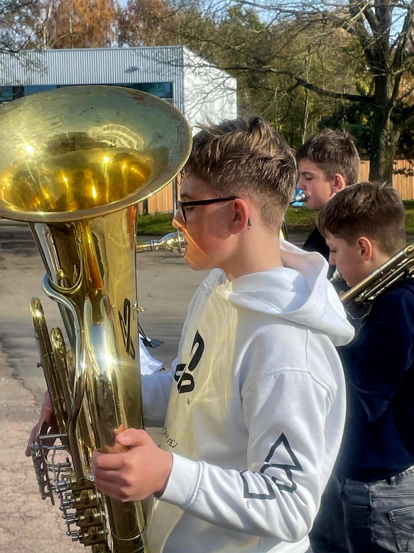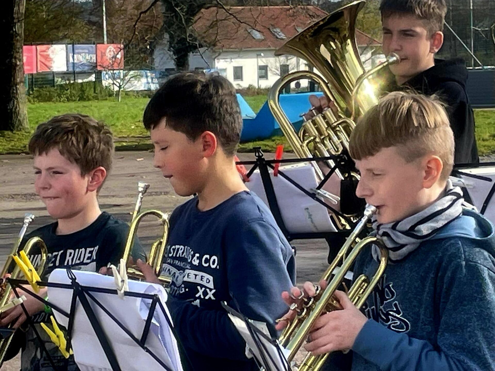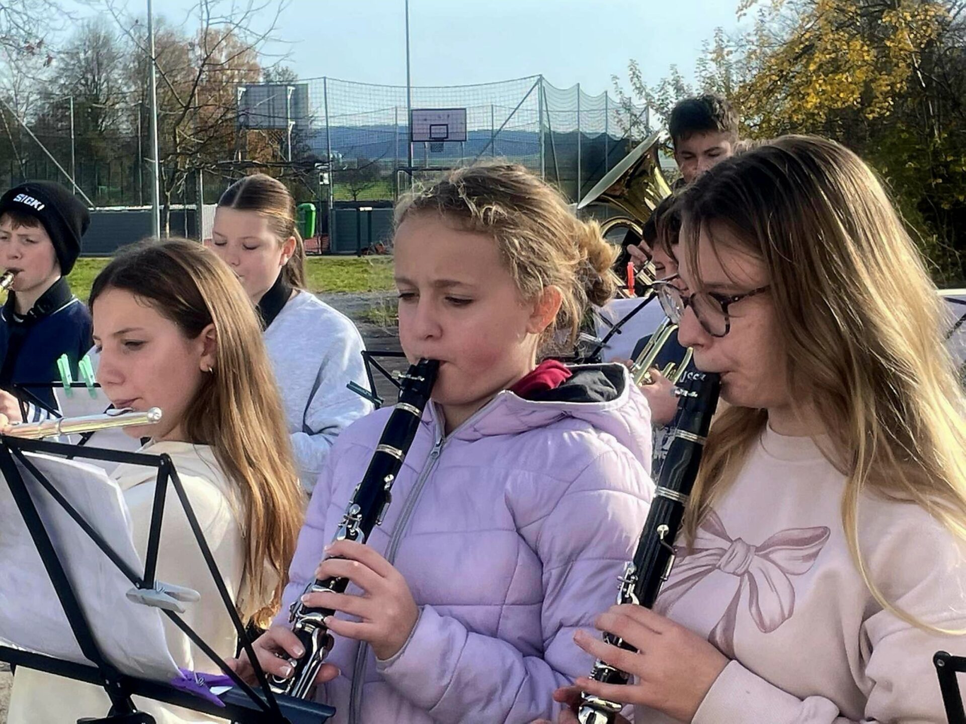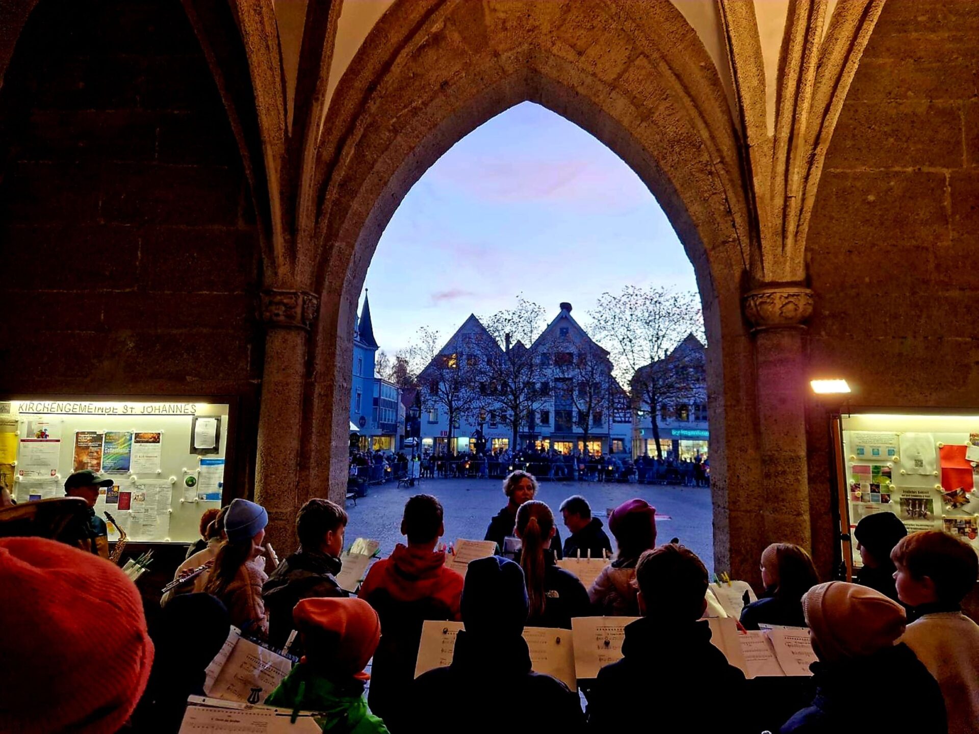 Treffpunkt für die jungen Musikerinnen und Musiker war die Oberamtei. Im Probelokal der Stadtmusik durften sie sich zunächst einspielen – und schon dort lag spürbare Vorfreude in der Luft. Bei ungewöhnlich mildem Novemberwetter setzte sich die große Gruppe anschließend gut gelaunt im Gänsemarsch in Richtung St.-Johanneskirche in Bewegung.