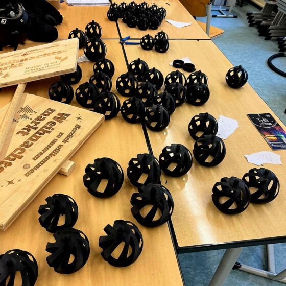Bereits im Frühsommer entstand in der Innovativ-AG unter der Leitung von Julian Bickel die Idee: Aus den 3D-Druckern sollen Leuchtkugeln entstehen, die den Wunschbogen mit Traumlichtern aus dem vergangenen Schuljahr durch ein faszinierendes, bewegtes Lichtermeer ergänzen. Erste Prototypen wurden gefertigt und die Konzeptideen weiterentwickelt – Befestigungen und Beleuchtung inklusive.